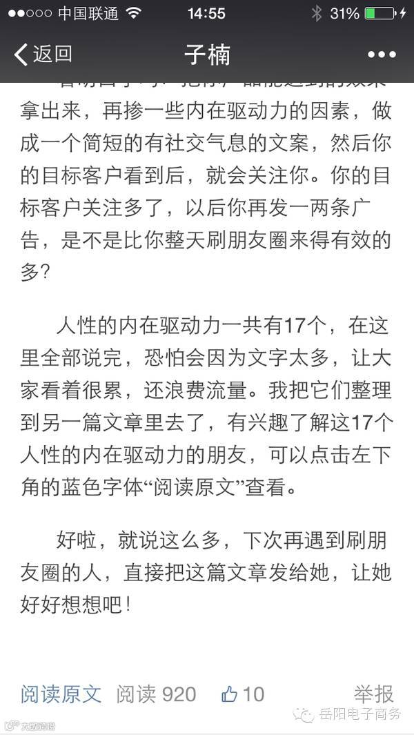 这篇文章的思路是,引导被朋友圈刷屏,且反感朋友圈刷屏的人转发,引导部分内心不想刷屏但是在刷屏的微商关注。因为针对性明确,所以转化率会比较高。但是高转化的文章,因为限制了目标客户群,所以一般转发量会低一些,所以这一是一个普通文案撰写者的头疼之处,高转化低流量,高流量低转化。