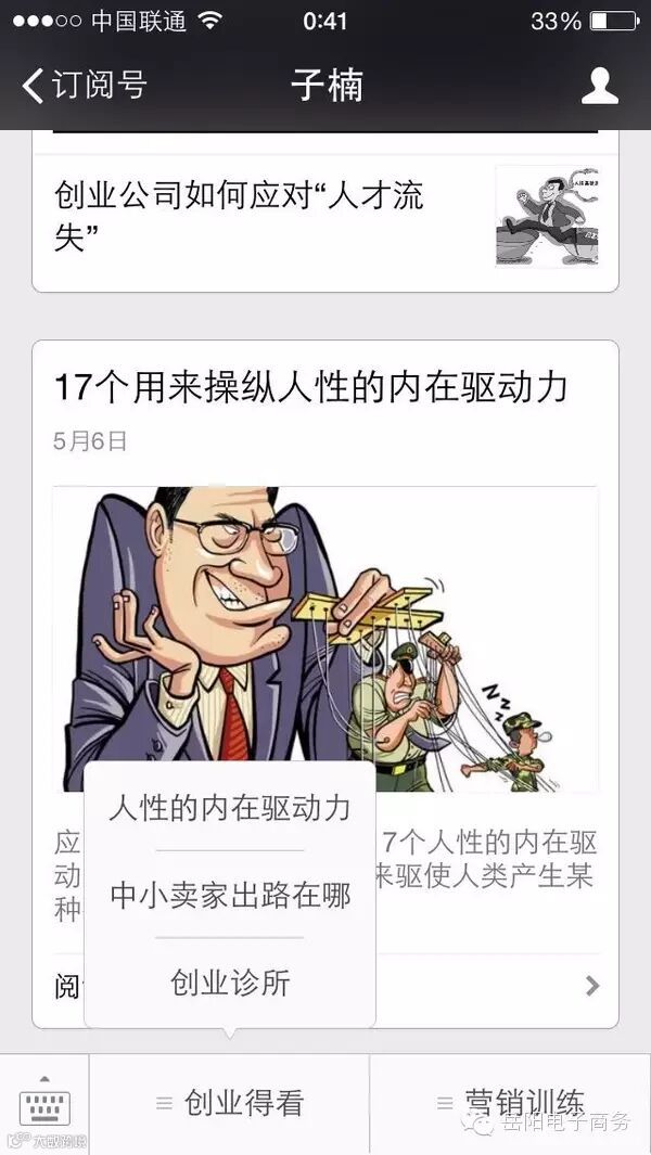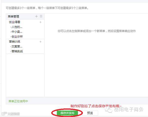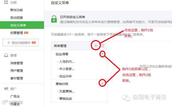 我把自定义菜单规划为2个部分(1个部分实在太丑,3个部分的话,有些朋友可能一开始没有这么多内容。我给企业做微信营销策划的时候关于这块一般都是3个板块,不过没事。咱以后可以慢慢加),分别是营销和创业。