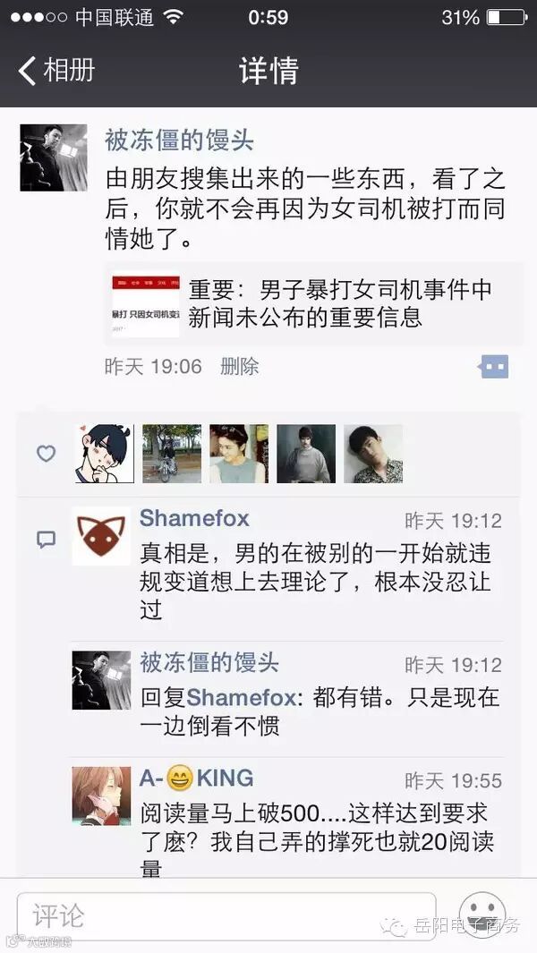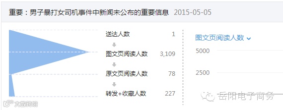 5月5号中午起床,开始编辑信息(早上看知乎又多了不少可以剽的东西了……),由于素材都找好,花个3小时左右,编辑出了这么一条流量文:重要:男子暴打女司机事件中新闻未公布的重要信息, 具体文案撰写的思路也很简单……首先我为这篇文章60%的内容剽窃了各位大神的信息而忏悔,求轻喷(其实主要是因为为了给大家做示范……大部分人做公众号 都很难100%原创了)。抄没关系……抄过来以后咱要把标题,内容,结尾做个优化,以达我们想要的效果。比如这篇文章标题加了“重要:”这个字来引导人们 看标题后面一长段字,后面很标题党地用了“未公布”之类的字,来引导大家看文章,具体里面很多引导阅读的用语,就不赘述了。感兴趣的朋友可以自己点进去 看。
