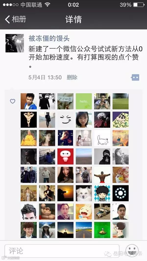 (有人想进去围观,希望我说一下这个公众号是多少,一开始我是拒绝的。因为担心作弊影响实验数据。不过想了想,我又不是大V,能来几个人加啊。这点 偏差不会影响数据的。所以,这个公众号是:子楠(nanzizhou)。不过第一步,这个从0到1有一点很重要,那就是你在自己的朋友圈里搞个“新号发布 会”类型的说说,引导自己的这几个朋友关注一下自己。)