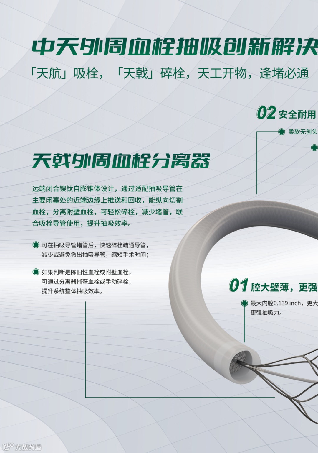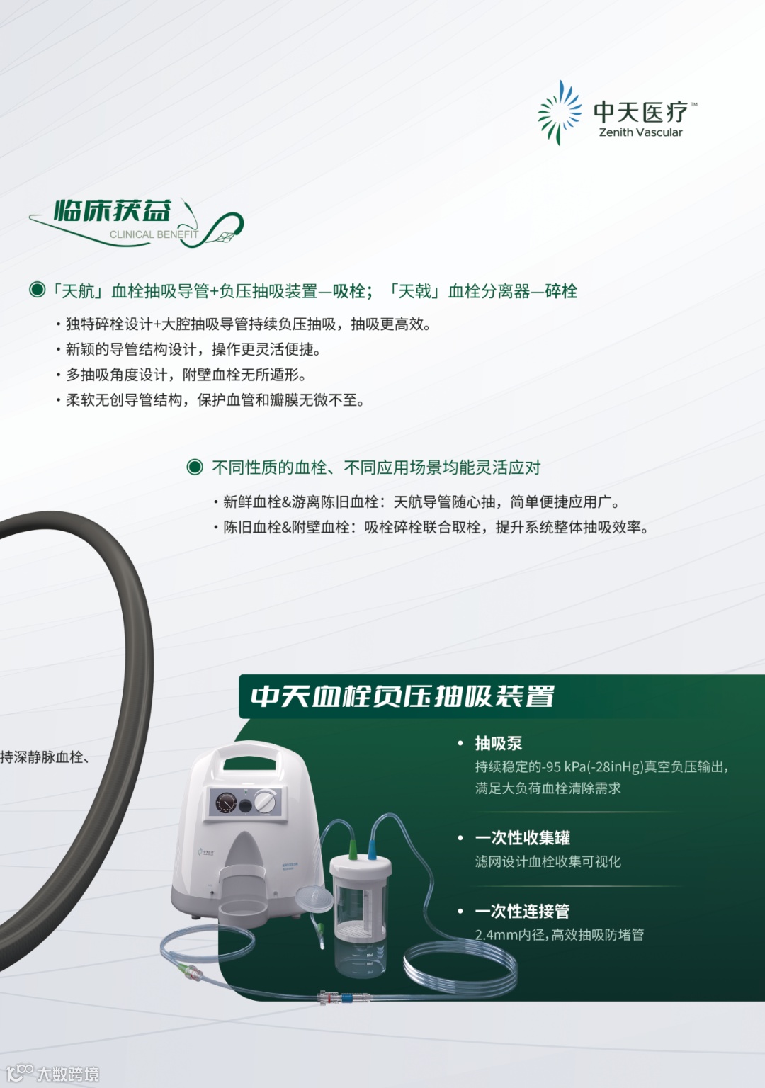 随着深静脉血栓、急性下肢缺血、肺栓塞等疾病的发病率不断提升,外周血栓抽吸的临床需求迅速增长。中天医疗基于创新理念,率先提出天航吸栓+天戟碎栓的血栓清除创新解决方案。该产品采用安全高效的负压抽吸原理,在不破坏红细胞的同时又能满足临床对于高负荷血栓的清除需求,其独创的“吸栓+碎栓“联合抽吸模式,有效避免堵管现象,提升手术效率。