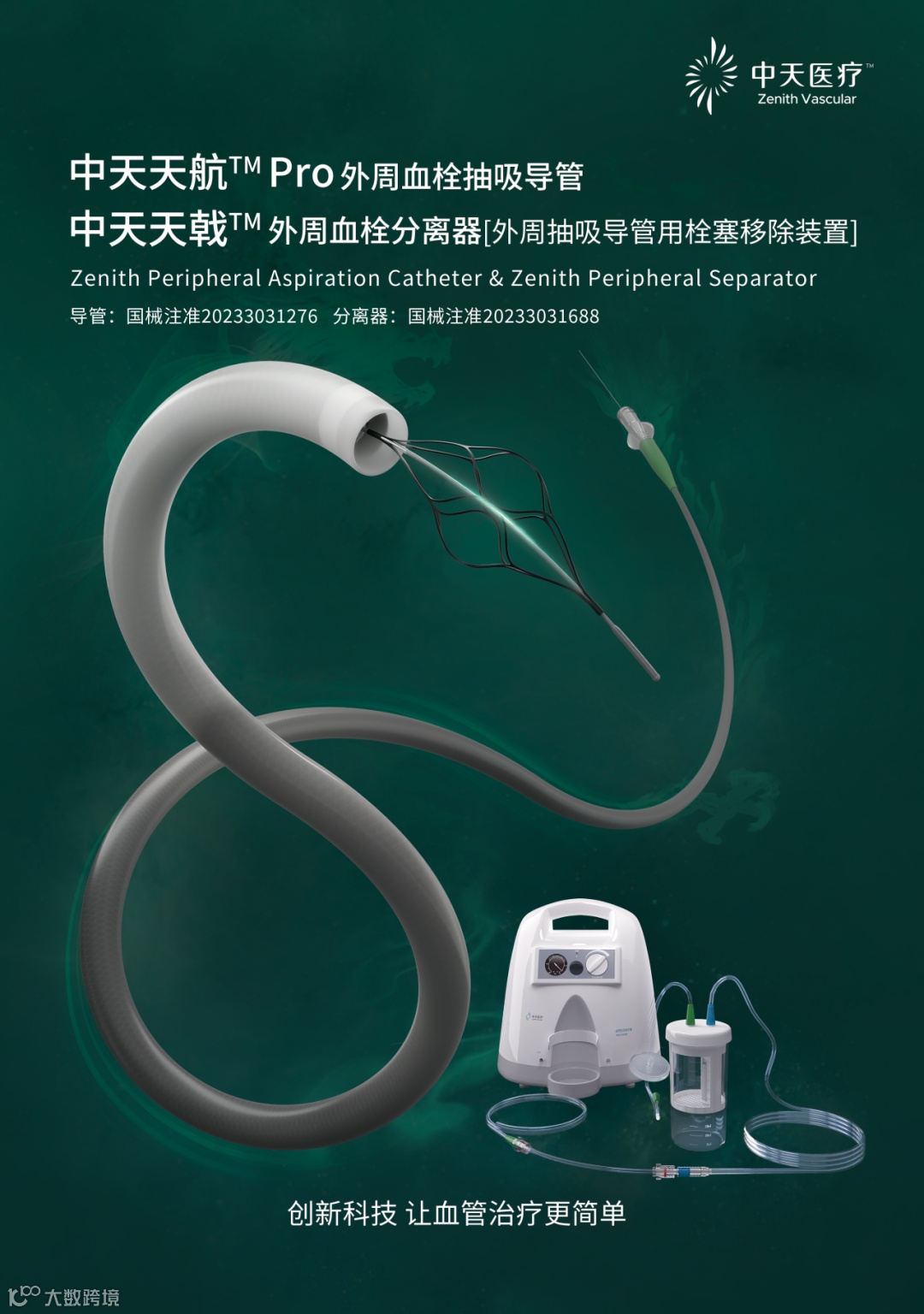 中天医疗基于其在神经血管系统内成功治疗大血管闭塞的经验,并结合外周血管疾病及解剖特点,专门为外周血栓清除推出了外周血栓抽吸创新解决方案,并于2023年年底获证。该解决方案包括三个部分:中天天航™Pro外周血栓抽吸导管、中天天戟™血栓移除装置(分离器),以及负压吸引泵和附件。针对临床中难以到达或清除的血栓,如大负荷血栓、亚急性陈旧血栓和附壁血栓,可尝试联合使用「天航」抽吸导管和「天戟」分离器,抽拉结合高效清除血栓。