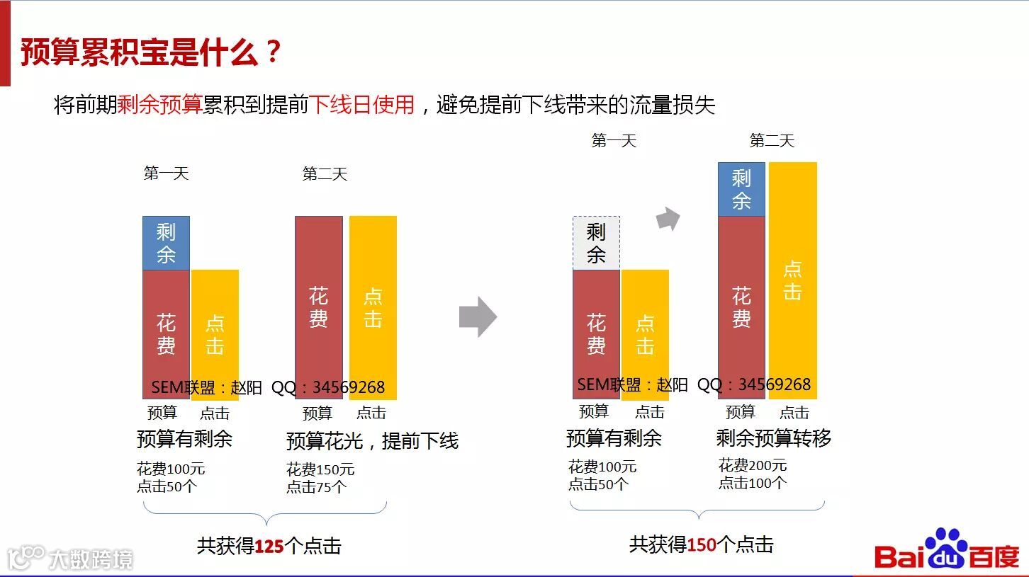 从PPT来看,如果我每天的预算是150元,如果第一天只消费了100块钱,没有达到预算。如果第2天150块钱不够花,提前下线,会把昨天的50元预算自动提升到第2天的预算当中。也就是说我提前下线那天会花到200。
