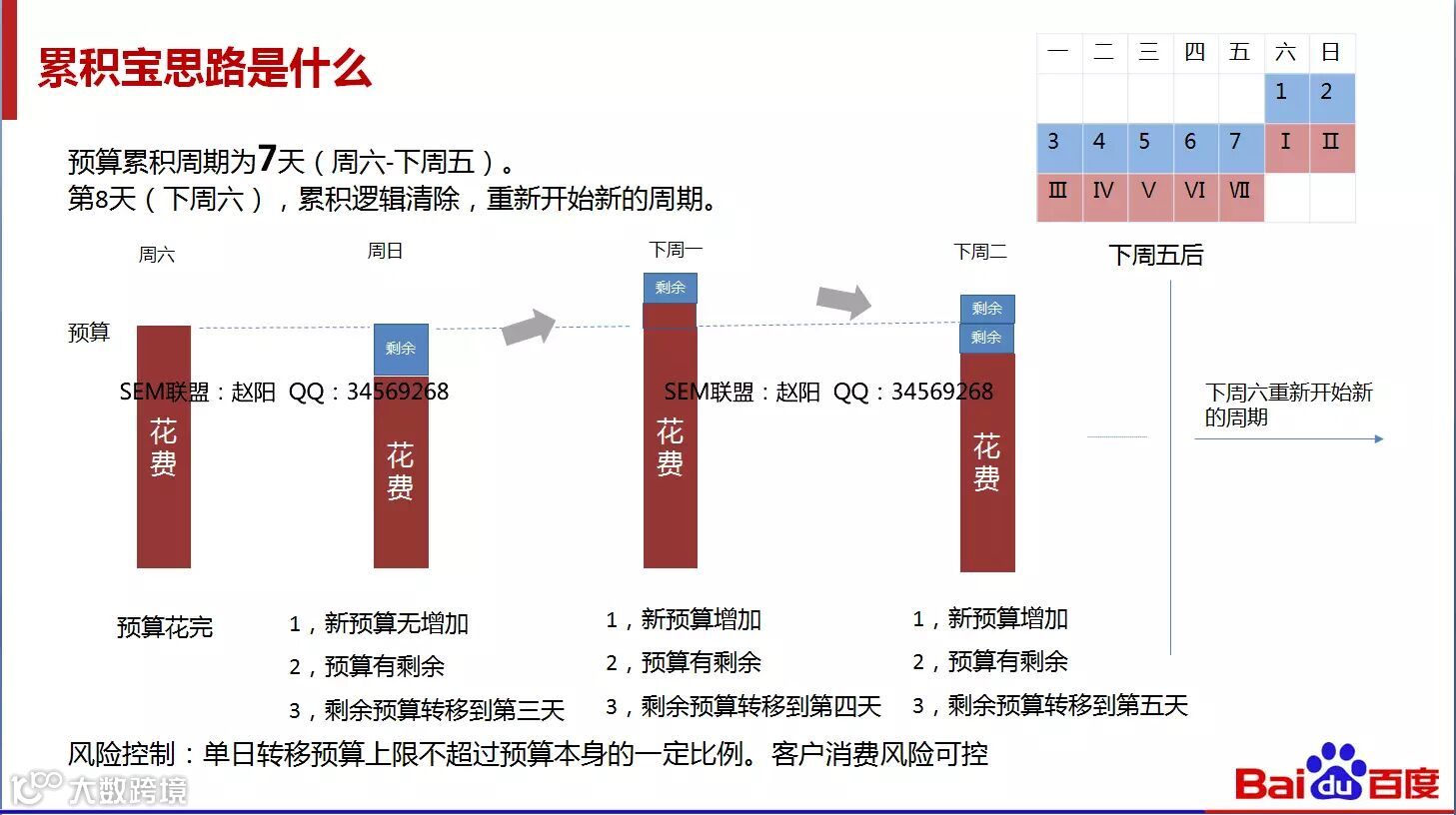 预算累积中期为7天(周六-下周五)到下周六会进行逻辑清除,重新开始新的周期。风险控制:单日转移预算上限不超过预算本身的一定比例。客服消费风险可控。