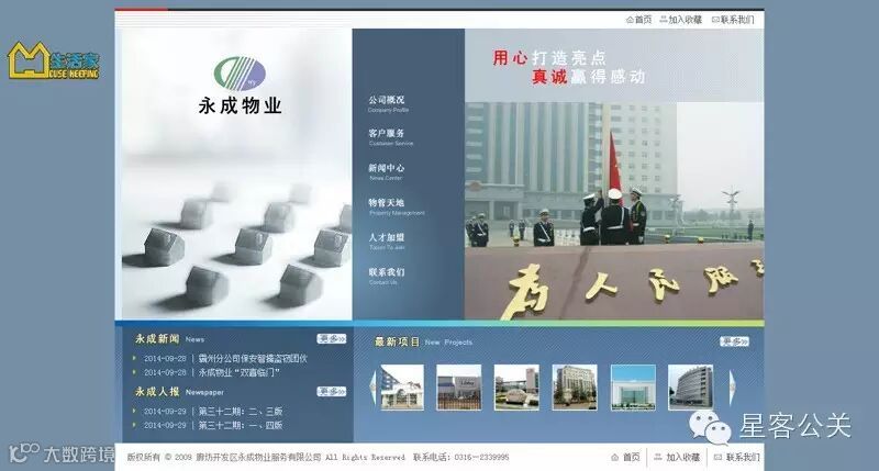 廊坊开发区永成物业服务有限公司是中国物业管理协会的会员单位,具有国家物业服务二级资质,是廊坊物业管理协会的副会长单位。公司成立于一九九八年三月十八日,注册资本300万元,先后管理着廊坊市委政府、邢台市委市政府、廊坊建行、中国联通公司廊坊分公司、霸州行政中心大厦、霸州供电大厦、霸州华夏民间博物馆、中国人民银行廊坊分行、廊坊管道局设计院、胜芳古镇、南宫市劳动就业服务中心大楼、新河县锦锈大厦、廊坊市人大机关办公楼、承德烟草大厦等200多万平方米的各类物业。