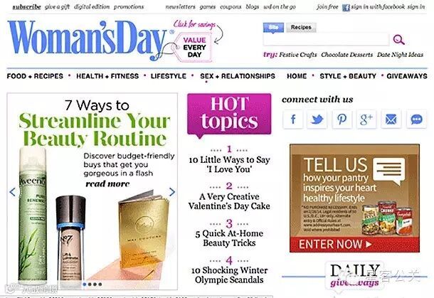 Woman’s Day 则是把所有女性最爱的颜色 (蓝、紫、绿) 都放上网页设计了。