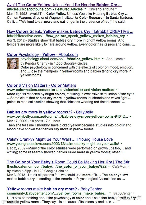 还有另外一项说法,认为黄色会引起小婴儿哭泣,让成人愤怒,到目前为止我并未找到证明此项说法的实证。