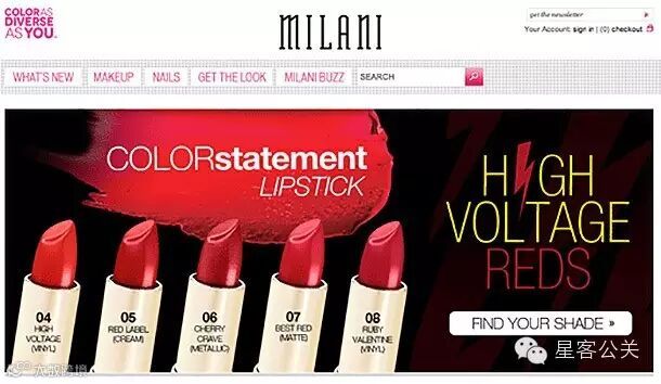 化妆品牌 Milani Cosmetics 专供女性市场,其网站首页上没有任何一点橘、棕、灰色。