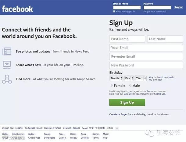 在颜色对于心理影响的调查中,蓝色传达信任感与宁静的作用是被证实过的,所以看看 Facebook 就知道,将蓝色运用在主页面上用以传达核心价值:透明与信任。