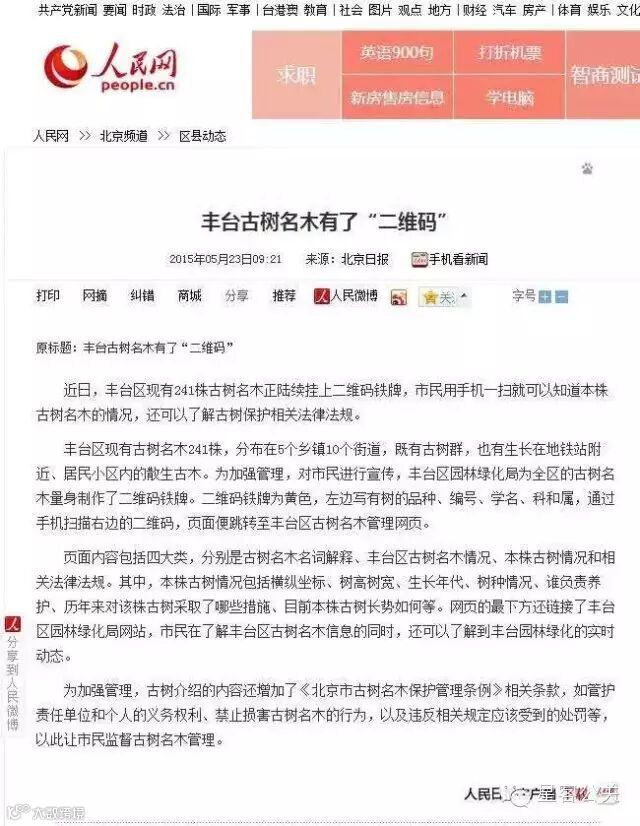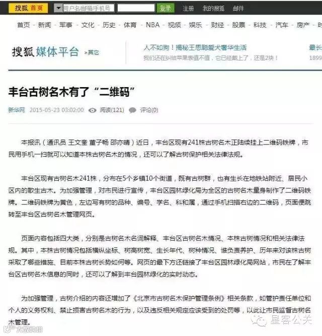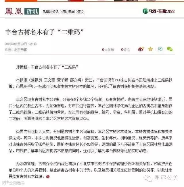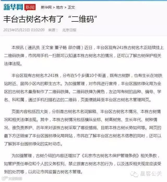 星客公关在2014年完成的丰台区园林绿化局古树二维码系统,近日受到了国内多家知名媒体报道,其中有新华网、凤凰网、搜狐、新浪、北京日报等,新闻正文如下: