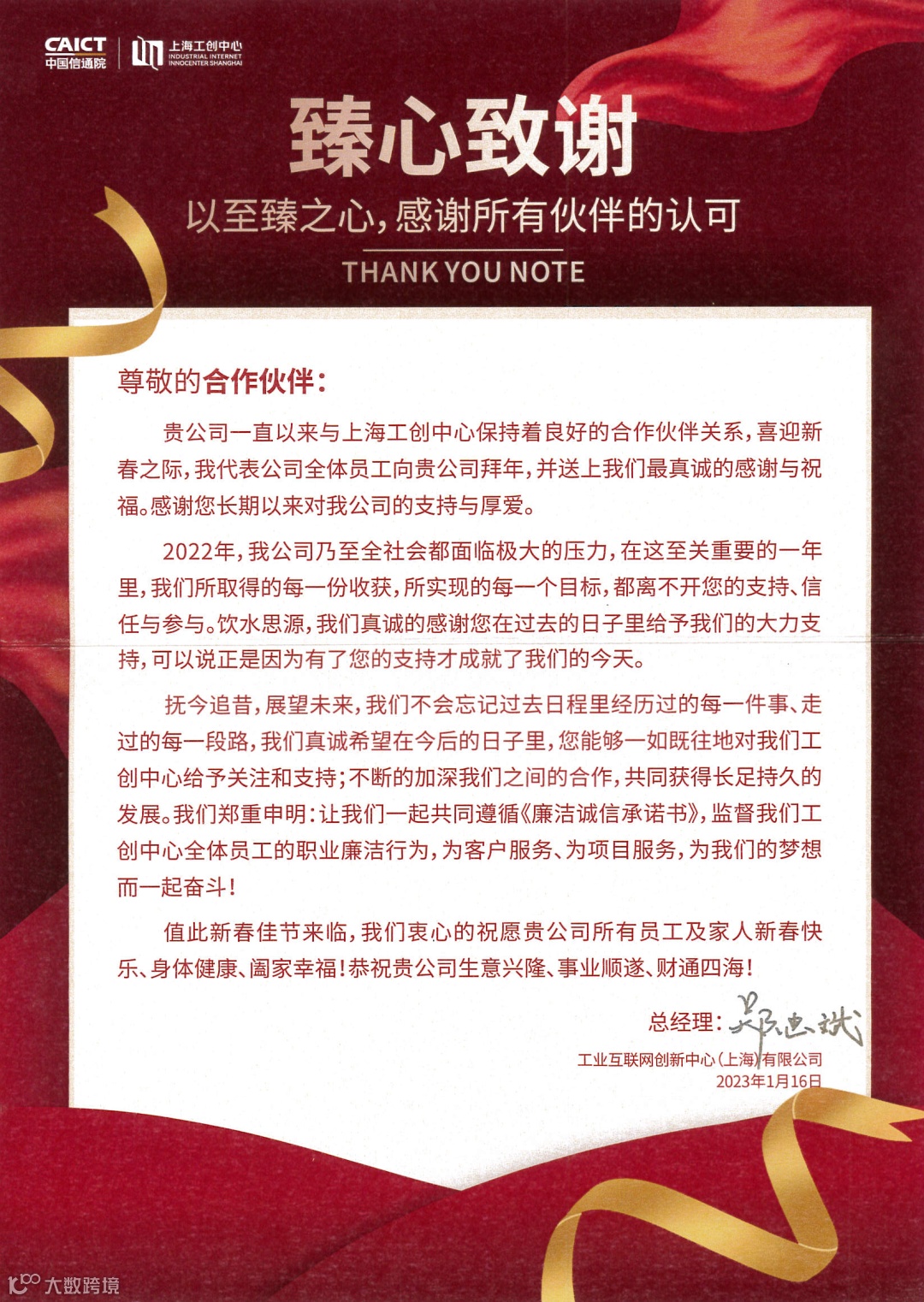 近日,和力传播收到一封来自中国信通院上海工创中心(以下简称:上海工创中心)的感谢信。信中对和力传播在2022年度提供的支持与配合表示衷心的感谢,也为和力全体员工及家人送来新春祝福。与感谢信一同送达的,还有上海工创中心授予的“优秀合作伙伴”奖杯。