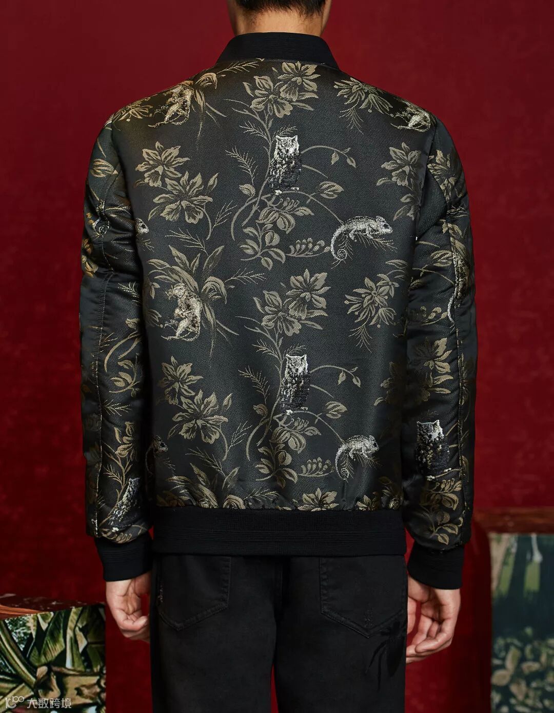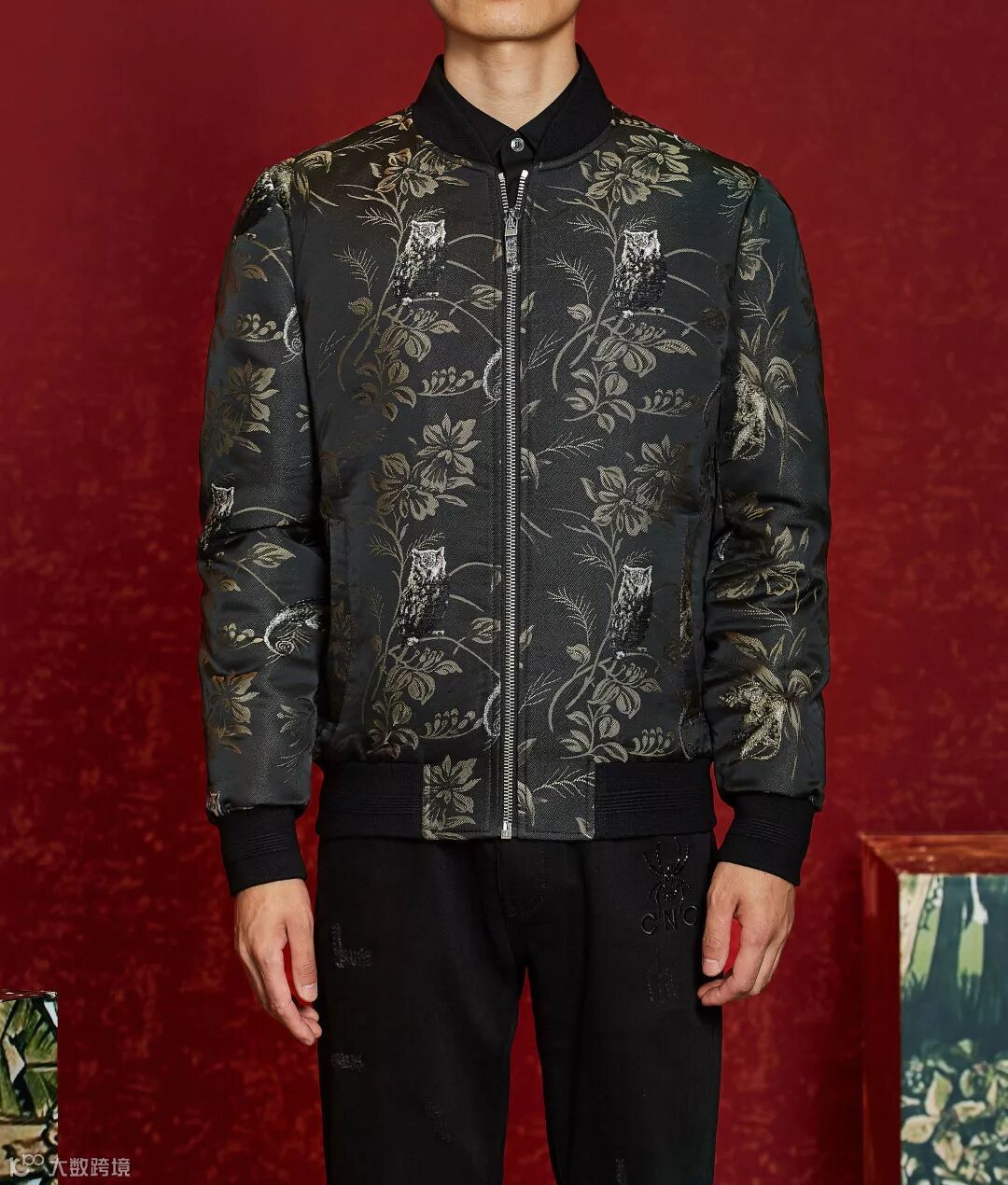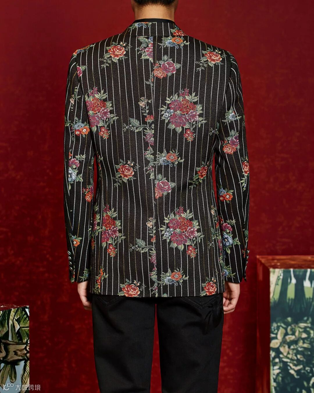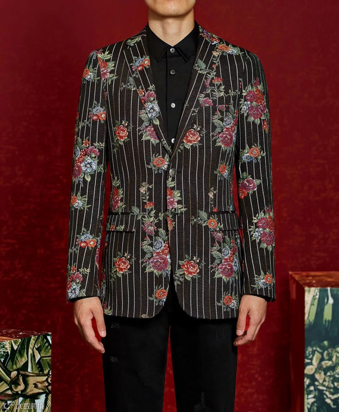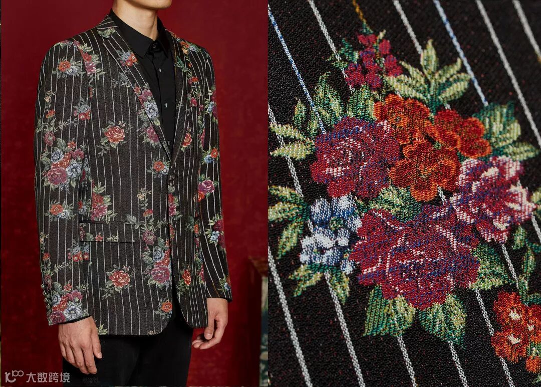 设计:竖纹拉伸身体的线条,搭配奢华彩色花卉设计,潇洒又典雅,衬托贵族的帅气、奢华。