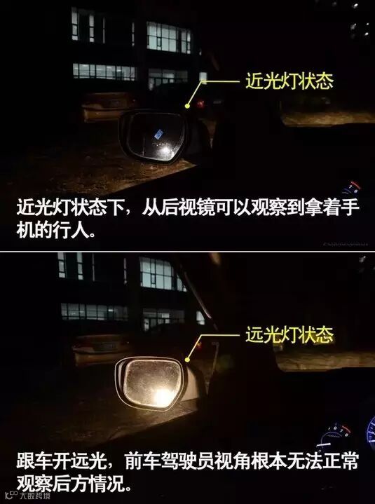 我们发现跟车时开启近光灯,前车基本不受影响,可以正常通过后视镜观察车辆两侧的情况。而当后车开启远光灯时候,就像有人用手电筒直射你的眼睛一样,此时对行车安全有很大影响。