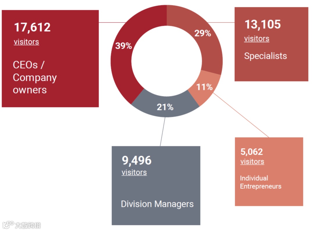 39%的MosBuild参展者是公司经理和所有者。21%的参观者是部门和领域的负责人,而专家占29%。个别企业家也出现在MosBuild的参观者中(11%)。