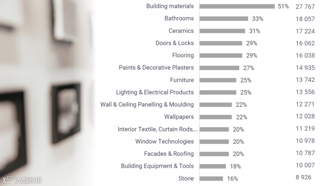 大多数MosBuild参观者对建筑材料(51%)、卫生洁具(33%)、陶瓷(31%)、门锁(29%)和地板覆盖物(29%)感兴趣。