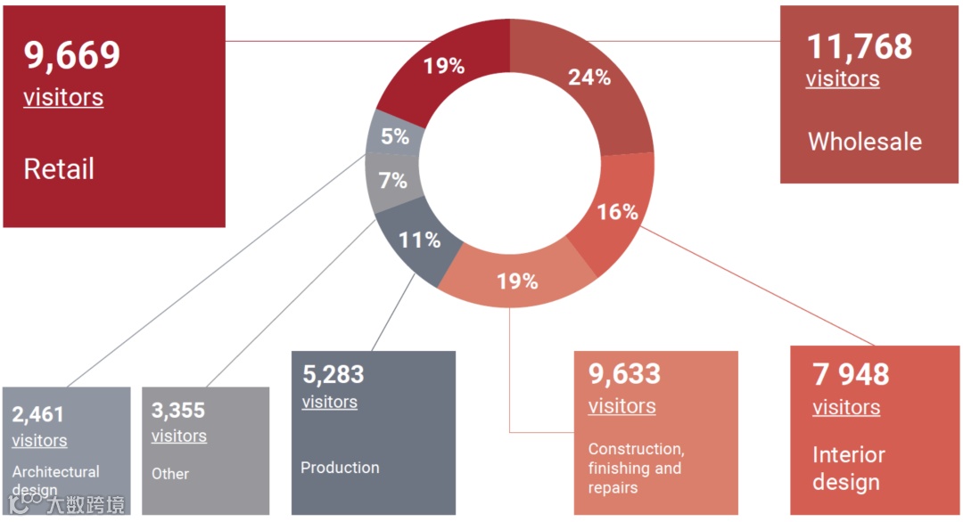 MosBuild的大部分参观者是批发贸易公司的代表(24%)。零售商与建筑商、设计师、装修专家所占的份额相同,均为19%。16%的参观者是室内设计师,11%是建筑和装饰材料制造商,5%是建筑设计师。