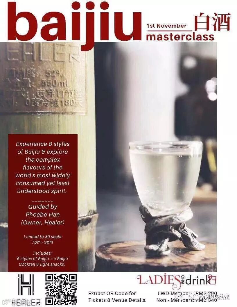 我们与Healer & Ladies Who Drink合作啦,加入我们的白酒大师班,了解中国烈酒文化。你将有机会品尝6种不同的白酒和白酒调制的鸡尾酒,你一定能乐在其中!