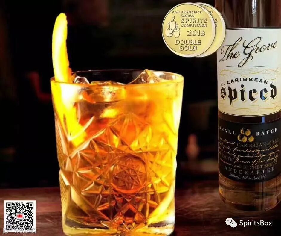 加入3块冰块和15毫升格罗夫加勒比香料朗姆酒