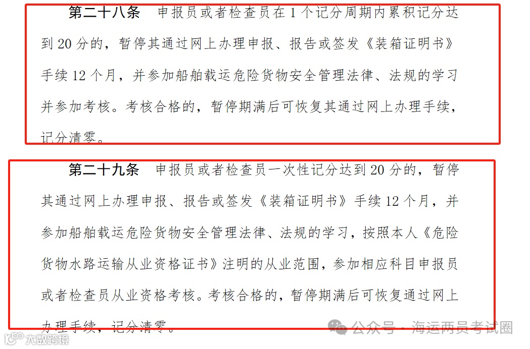 2、针对一个记分周期内,申报员或者检查员累积记分在15~20分之间的,新增以下规定(请看船载危险货物申报员和集装箱装箱现场检查员管理办法》第二十七条):
