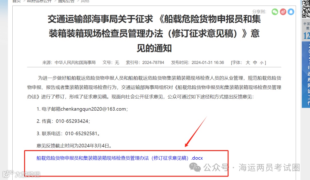 2024年1月31日,国家海事局网站发布了关于征求《船载危险货物申报员和集装箱装箱现场检查员管理办法(修订征求意见稿)》(以下简称《新办法》)意见的通知(请看附件),面向社会公众广泛征求对《新办法》的修订意见。