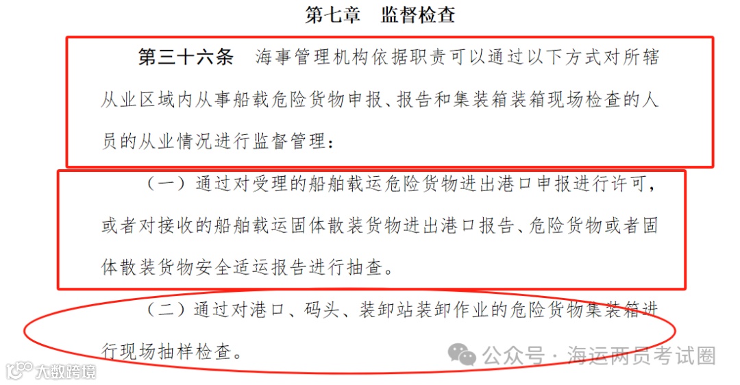 《船载危险货物申报员和集装箱装箱现场检查员管理办法》增加了第七章“监督检查”,明确了海事管理机构在日常工作中,如何对两员工作进行监督抽查。