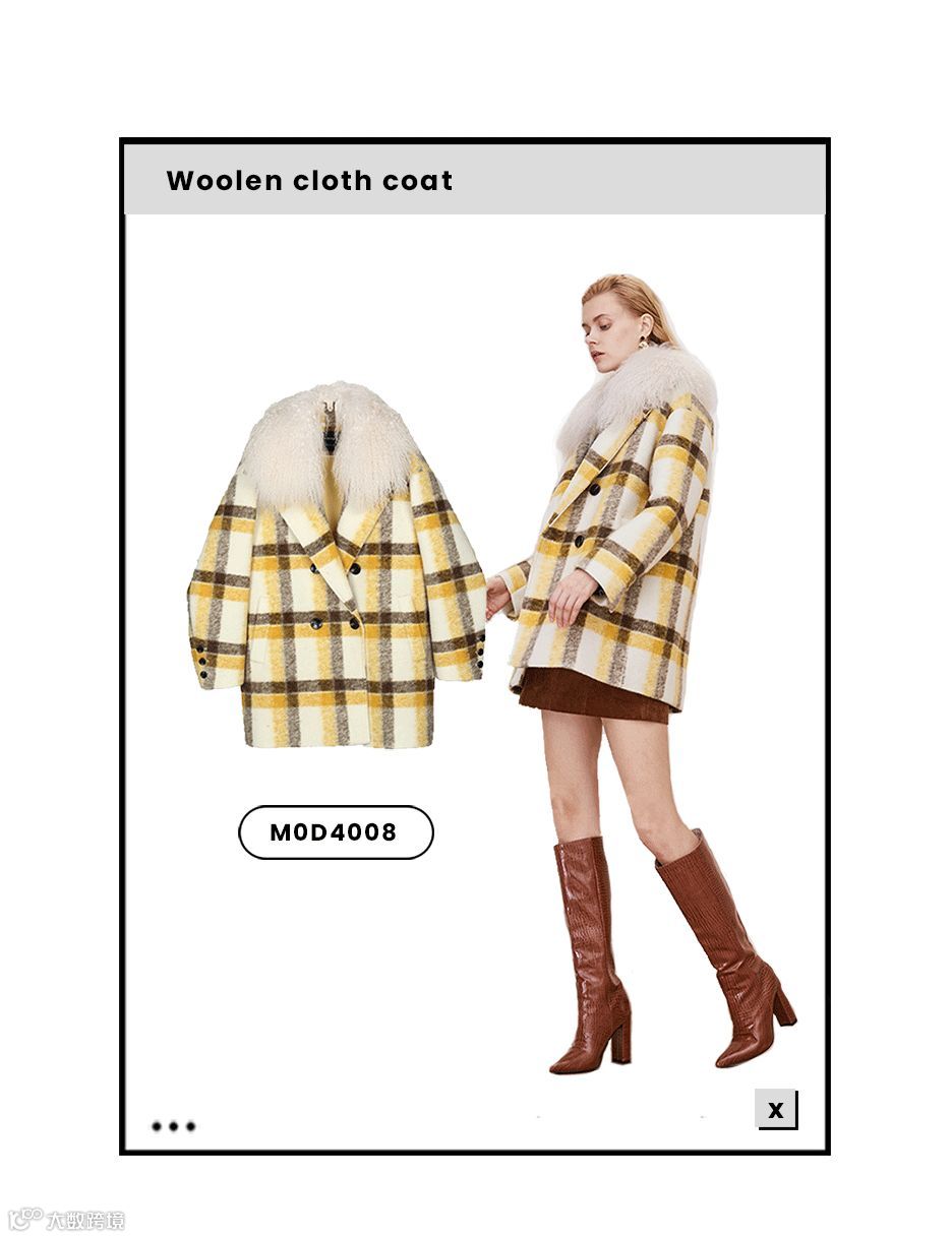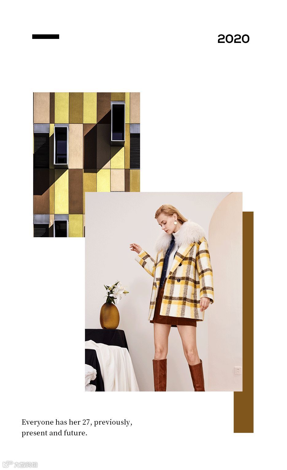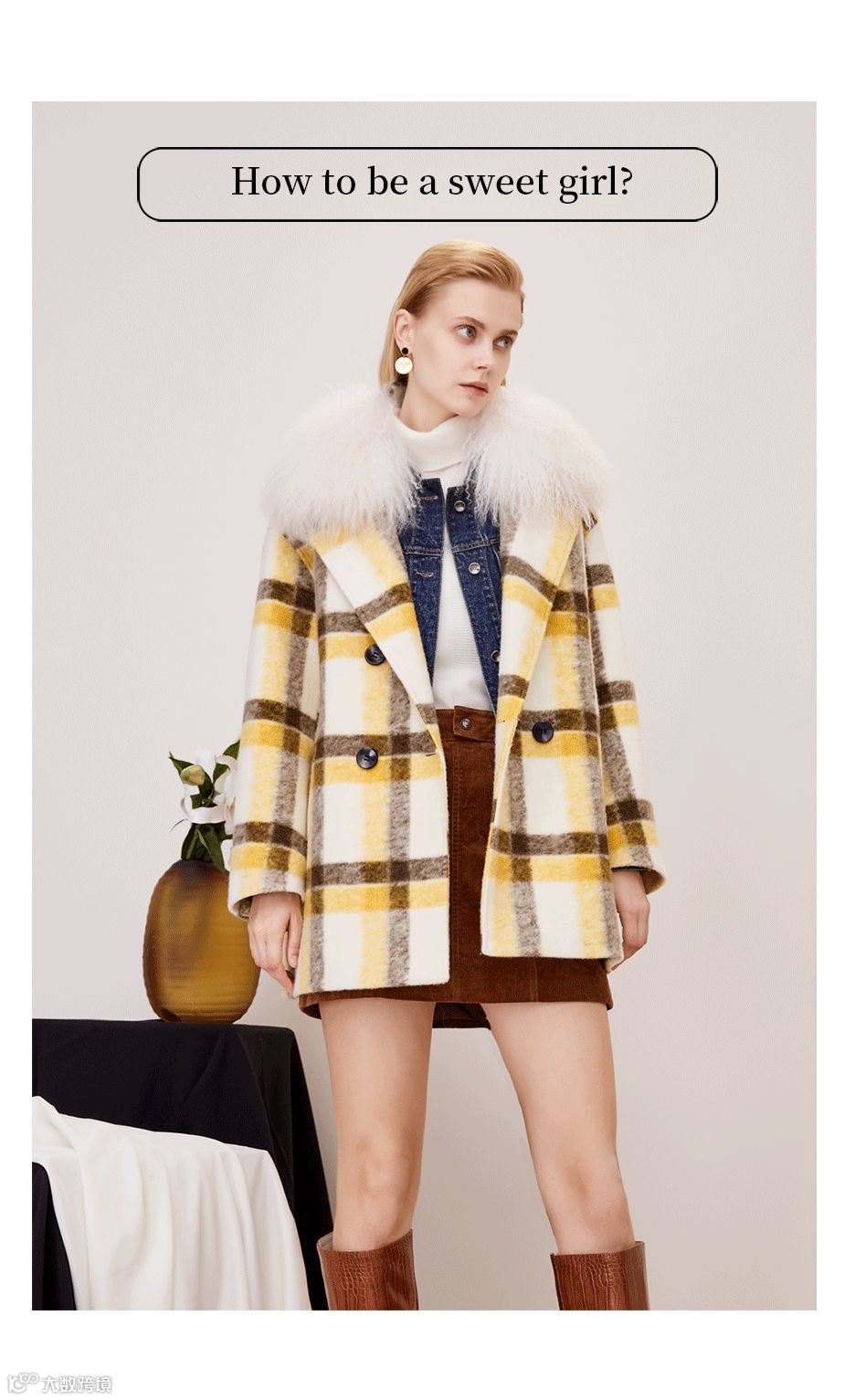 奶油黄的色系,整体明亮,为冬天增加了温暖的色彩,高级的颜色交织,潮流的时尚感up!温柔的大毛领,整体增加了甜美的气息。