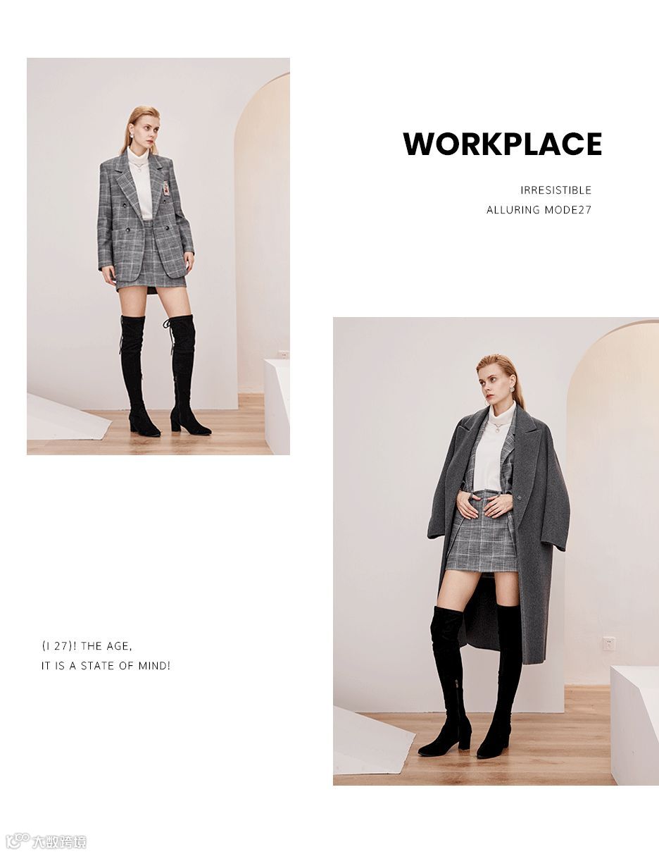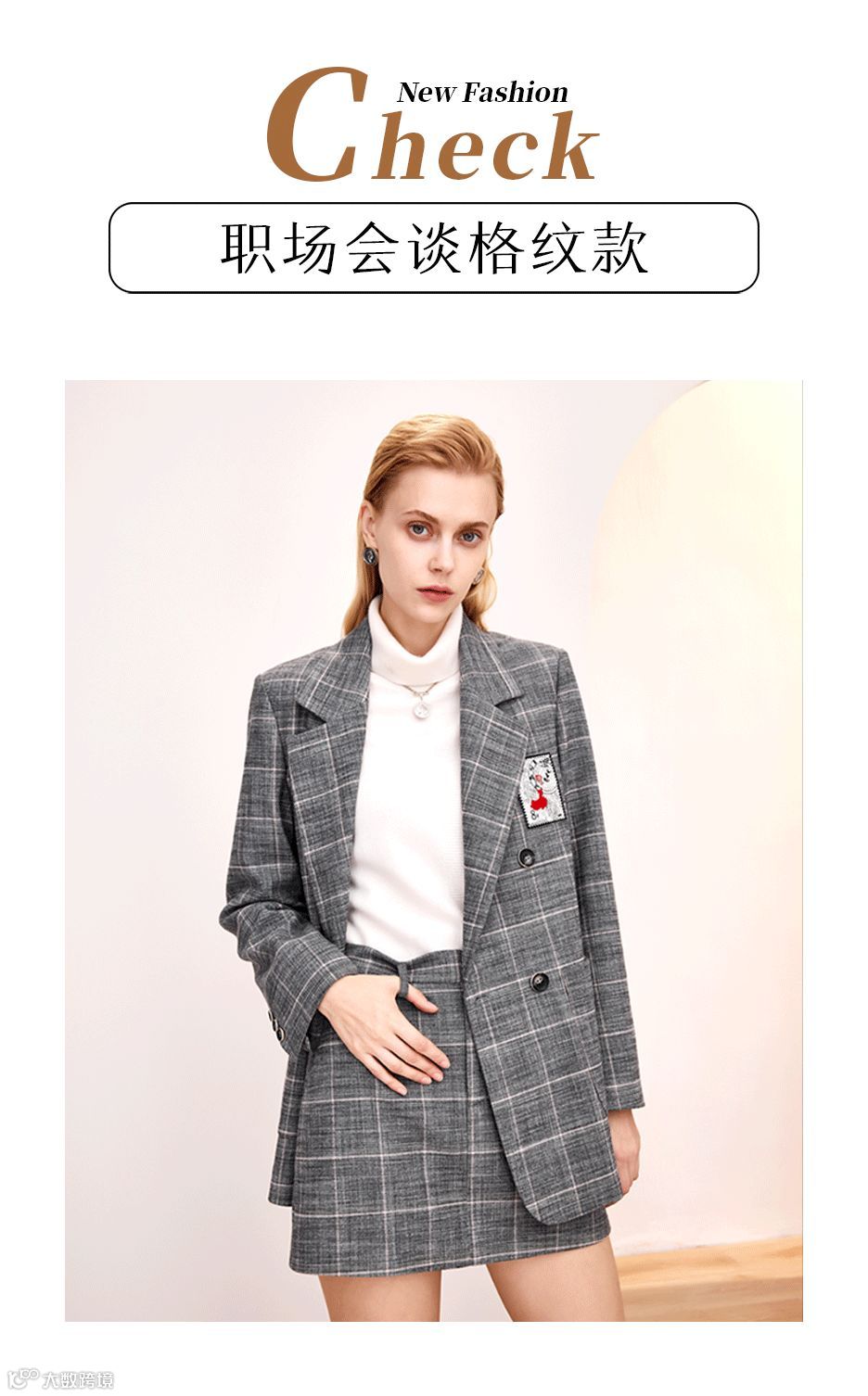 格纹西装、短裙,灰色的调性不挑肤,百搭,偏休闲的版,职场的小姐姐必买款·,正式又不会显得严肃,冬天随便搭呢子外套,见客户、去上班大方又得体。