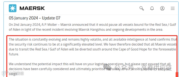 马士基当天在一份声明中表示,地区局势不断发展仍然高度紧张,充满不确定性,所有现有情报都证实,安全风险仍然处于显著升高的水平。因此,马士基决定在可预见的将来,所有要过境红海/亚丁湾的马士基船只将绕道好望角向南航行。