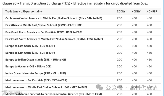 马士基指出,之前宣布的1月1日起征收红海/亚丁湾附近航行的附加费(TDS)、旺季附加费(PSS)以及紧急应变附加费(ECS)仍然适用于受到干扰船只上的所有货物。这意味着,为了应对当前区域的挑战和持续的问题,这些附加费用将继续存在并对相关货物适用。