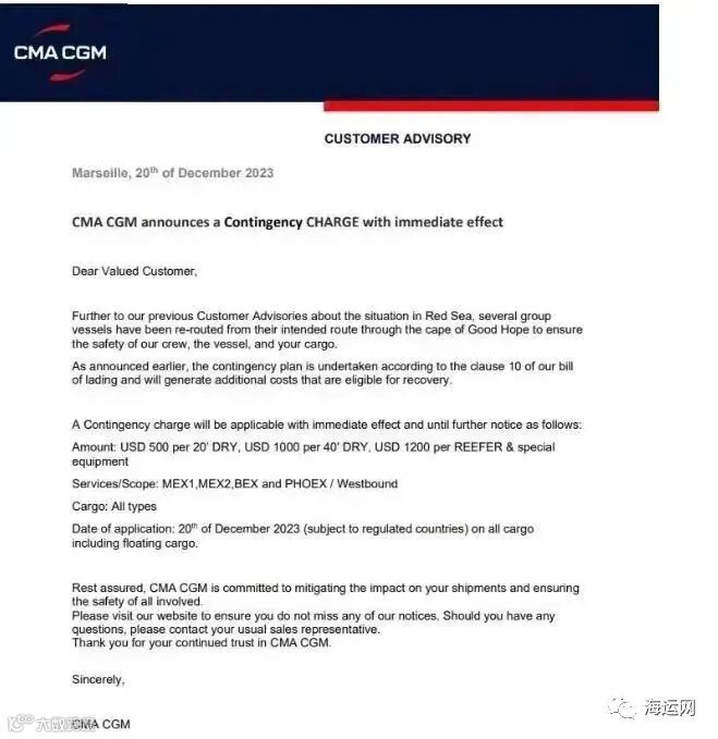 同时宣布,自12月20日起,征收一项应急费用,每20尺干箱500美元,每40尺干箱1000美元,每个冷藏集装箱和特殊设备1200美元。