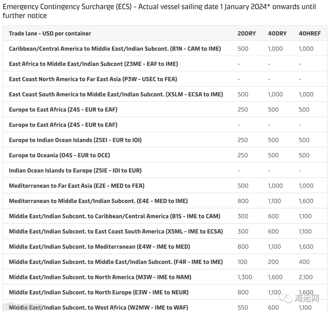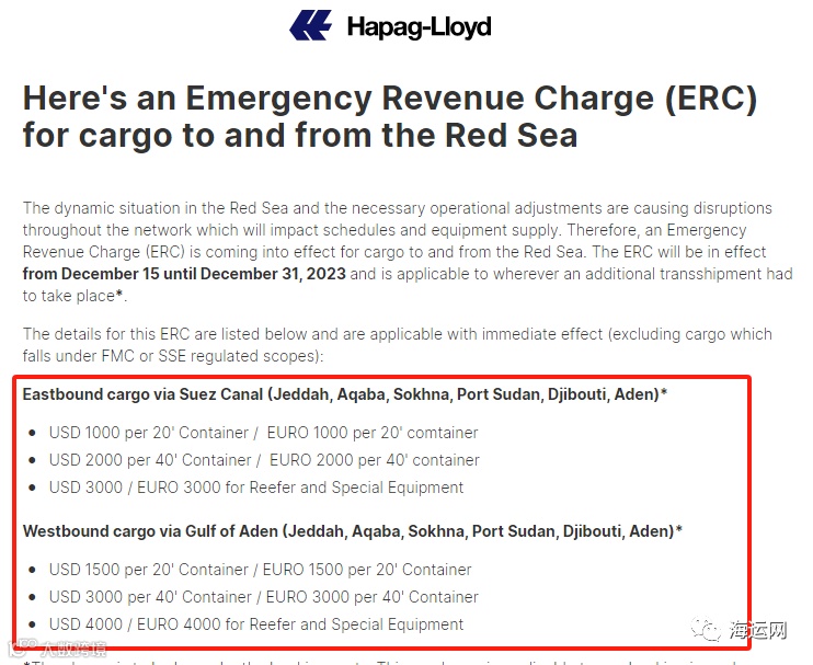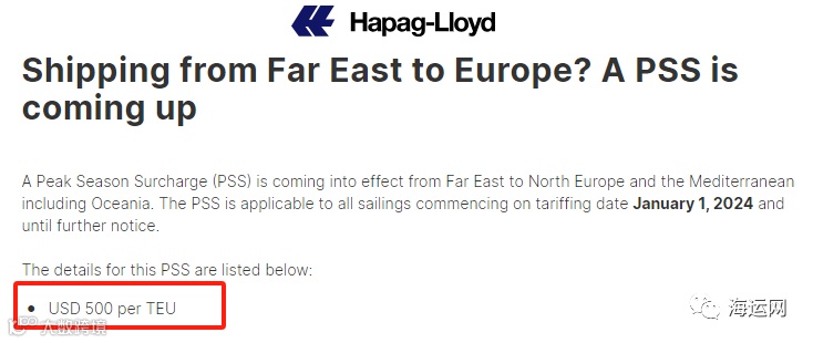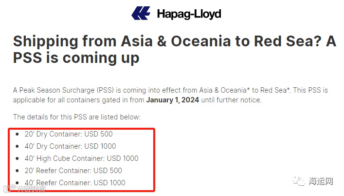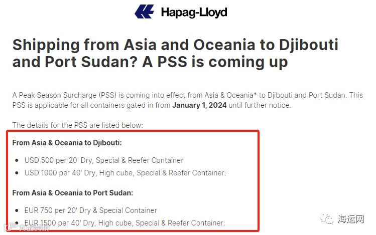 赫伯罗特12月20日发布公告称,自2024年1月1日起,征收从亚洲和大洋洲到红海/吉布提和苏丹港的旺季附加费PSS。每20尺箱500美元;每40尺箱1000美元;从远东运送到欧洲每箱500美元。具体如下: