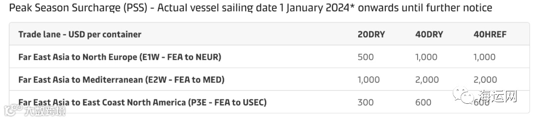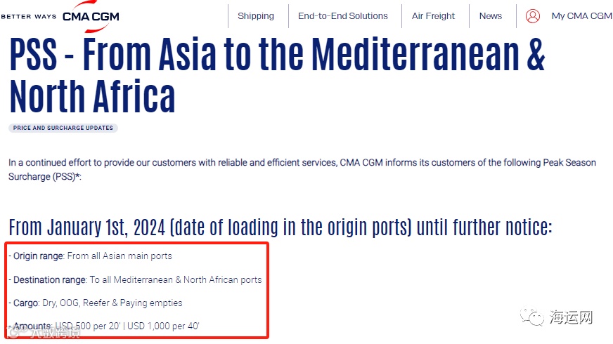 达飞轮船还发布公告称征收旺季附加费,1月1日起,将对亚洲至地中海和北非航线的货物征收PSS,对箱型包括干箱、OOG、冷藏箱和付费空箱征收500美元/TEU、1000美元/FEU的费用。收费详情如下:
