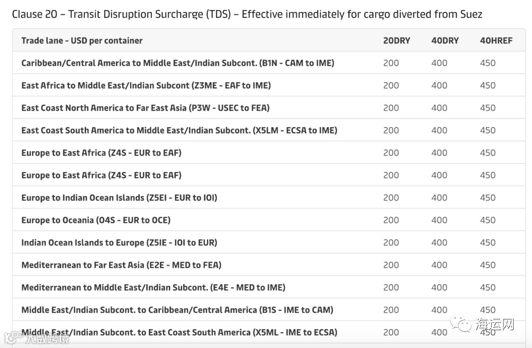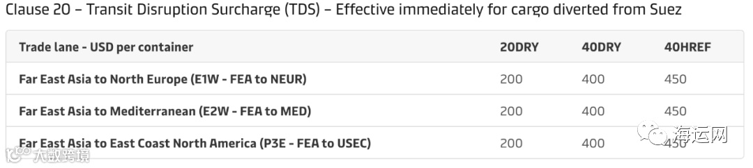 马士基表示,从中国运往北欧的一个20英尺标准集装箱总共需要支付700美元的额外费用,其中包括200美元的TDS和500美元的PSS。该公司补充称,运往北美东海岸的每个标准集装箱将收取500美元的费用,其中包括200美元的TDS付款和300美元的PSS。马士基还表示,其服务网络其他部分的航线将受到苏伊士运河中断的影响,从而引发大范围行程的紧急意外附加费。