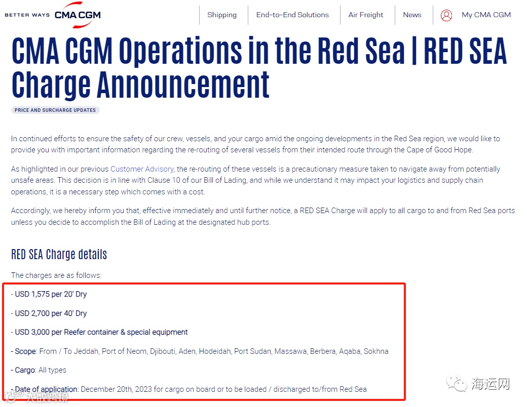 达飞轮船20日宣布征收“红海附加费”,该费用将适用于进出红海港口的所有货物,立即生效并直至另行通知。每20尺干箱1575美元,每40尺干箱2700美元,每个冷藏集装箱和特殊设备3000美元。