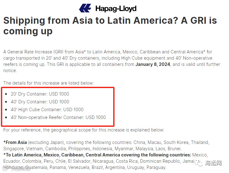 从亚洲运送到拉丁美洲GRI费用:从亚洲到拉丁美洲、墨西哥、加勒比海和中美洲的20英尺和40英尺干货集装箱(包括高柜和40英尺非工作冷藏箱)运输的货物即将全面上调 (GRI),所有箱型1000美元。本GRI自2024年1月8日起适用于所有集装箱,有效期至另行通知为止。