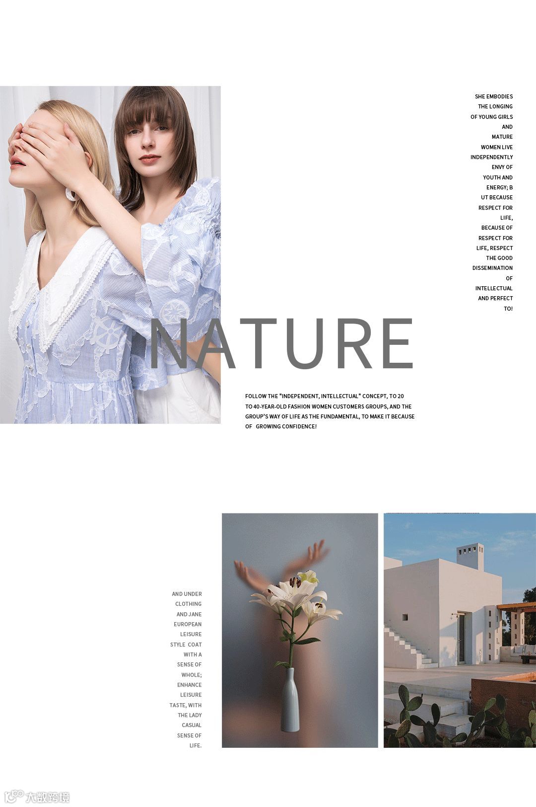 热爱生活、热爱自然,化繁为简,注重生活的品质,当代女性注重的生活状态,“独立而自信”,追寻自己的价值化,注重内外兼修的学习理念。对于世界不断的认知与提高,更加的注重环保、自然、舒适的结果。越来越多的女性成为了生活的艺术家。事业、生活平衡的发展。
