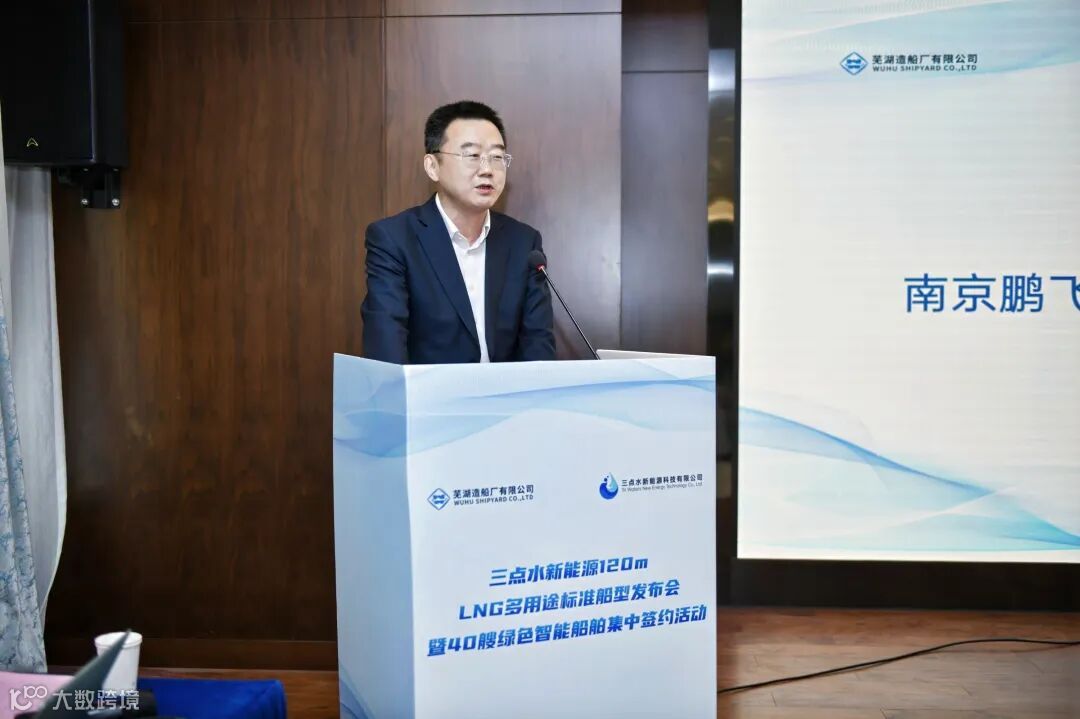 四月芳菲,皖南大地春重色浓、生机勃发。4月15日,“江豚L-120”多用途标准船型发布会和集中签约仪式在安徽芜湖隆重举行。南京鹏飞智慧物流股份有限公司董事长岳爱忠应邀出席活动,与船舶研发制造商芜湖船厂三点水新能源科技公司签署20艘新能源船舶建造协议,并代表参会的首批建造业主登台致辞。