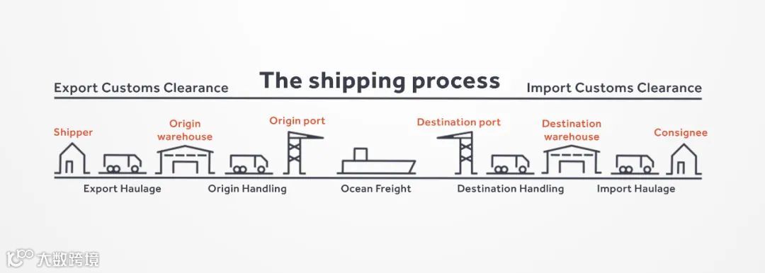 出口拖运、原产地处理、出口清关、海运、进口清关、目的地处理和进口拖运。