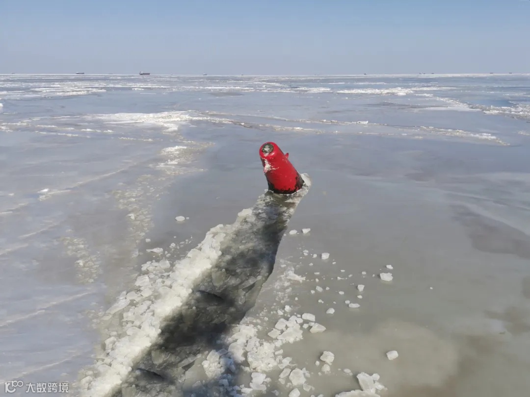 一是结构强,受力面积小。冰标上部锥形的结构可以减少海冰的膨胀压力,其较小的受力面积可以有效减少海冰正面推力。我们经常可以在冬季的海面看到冰标后面拖起一条长长的尾巴,那是因为流冰被冰标分开后会出现一条狭窄的“无冰带”,宛若冰标在海冰中“航行”。