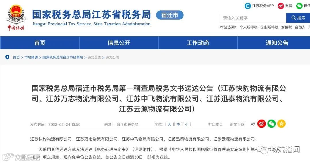 近日,据国家税务总局宿迁市税务局第一稽查局税务处理决定书显示,江苏快豹物流有限公司、江苏万志物流有限公司、江苏中飞物流有限公司、江苏迅泰物流有限公司、江苏云源物流有限公司等多家物流公司经检查人员通过实地核查、电话查询、涉税事项办理核查以及其他征管手段,仍对单位及法定代表人查无下落。结合征管信息系统查询及银行资金交易信息调查,认定自设立登记以来,在没有真实经营业务的情况下对外虚开增值税专用发票。