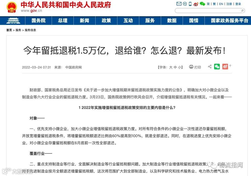 今年留抵退税1.5万亿,覆盖交通运输仓储和邮政业等行业