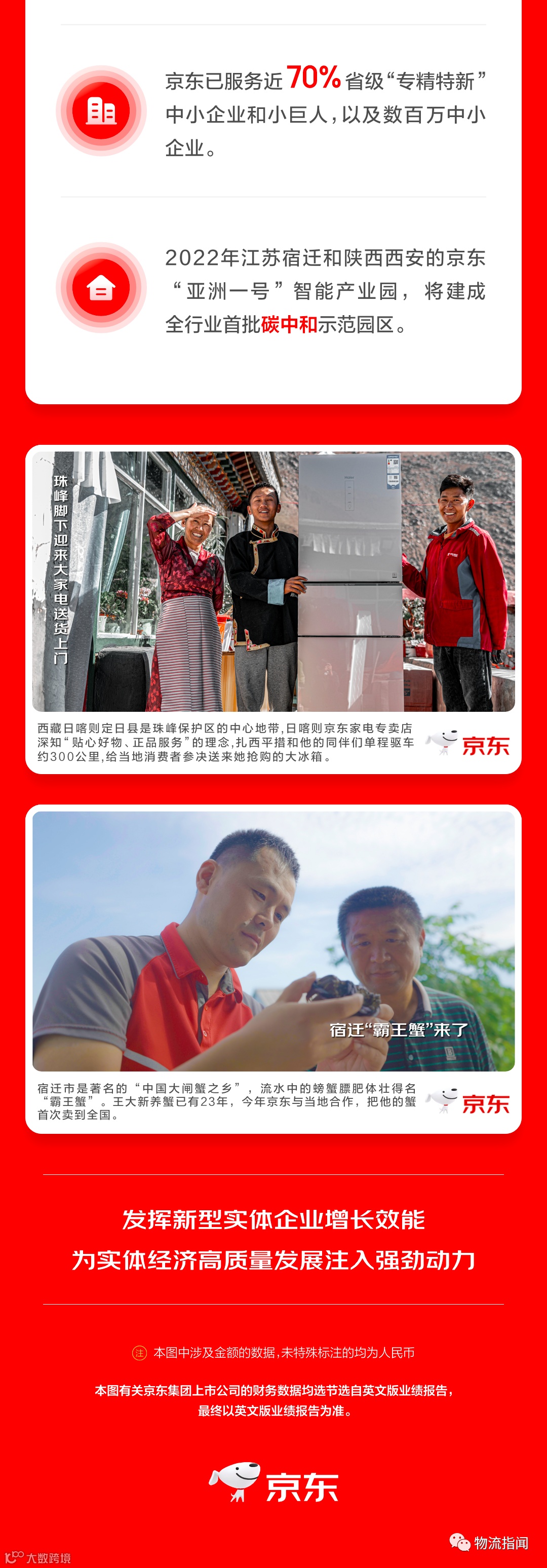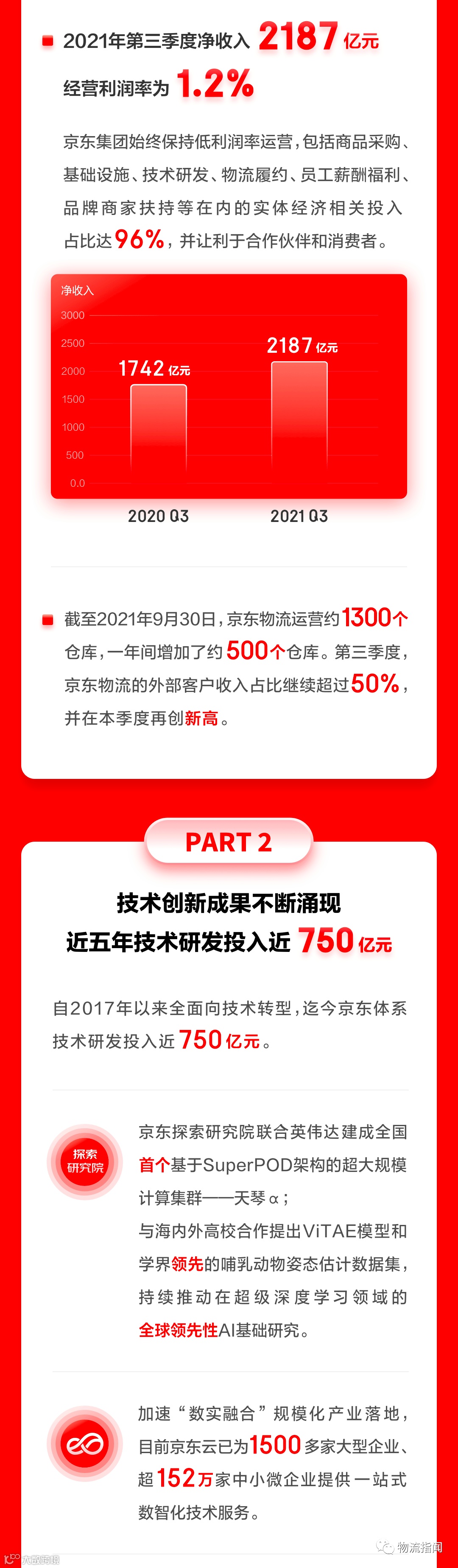 截至2021年9月30日,京东物流已经运营约1300个仓库,从去年三季度末以来,一年间增加了约500个仓库。去年三季度末以来,京东物流在全国新增了13座“亚洲一号”智能产业园,通过多种自动化设备的使用,新投用的“亚一”综合效率提升超4倍,大大提升了偏远地区的配送时效。