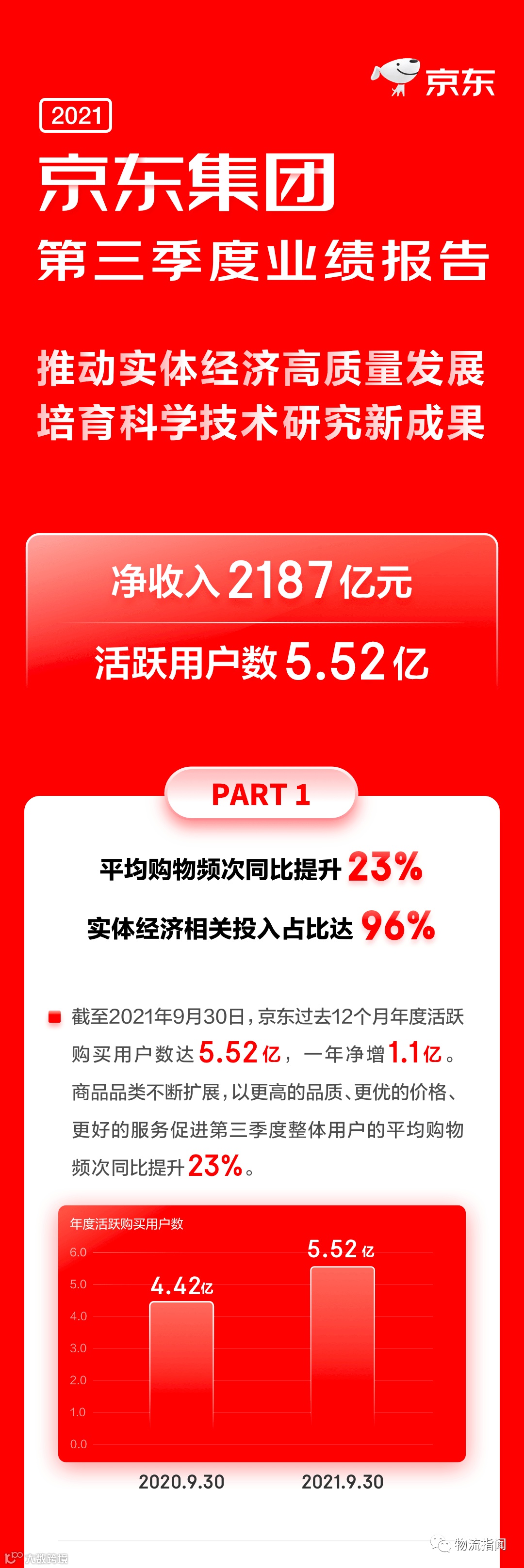 11月18日,京东集团发布了2021年第三季度业绩。报告显示,2021年第三季度,京东集团净收入为2187亿元人民币(约339亿美元),同比增长25.5%。其中96%的成本和费用都用于实体经济投入,主要有商品采购、基础设施、物流履约、技术研发、员工薪酬福利以及对品牌商家扶持等。
