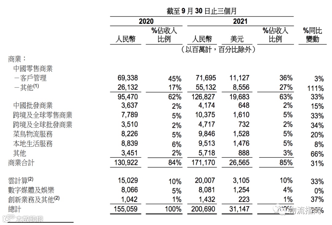 财报显示,本季度菜鸟物流服务收入98.46亿元,同比增长20%。季度内,菜鸟网络持续加强其国际物流基建,通过实施国际货运服务、目的地仓库及履约,以及最后一公里派送服务,加强端到端的物流能力。截止2021年9月30日,菜鸟网络运营超过300万平方米的跨境仓库以支持集团的跨境业务。菜鸟网络也推出各种服务来提升国际消费者的购物体验,包括于速卖通有运营业务的4个欧洲国家推出自提柜服务。