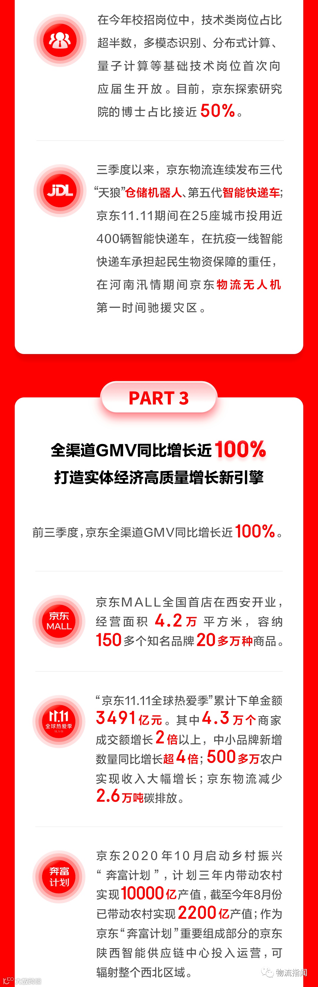 今年三季度以来,京东物流连续发布了三代“天狼”仓储机器人、第五代智能快递车;京东11.11期间,在全国25座城市投用近400辆智能快递车;在抗疫一线,智能快递车承担起民生物资保障的重任;在河南汛情期间,京东物流无人机第一时间驰援灾区。