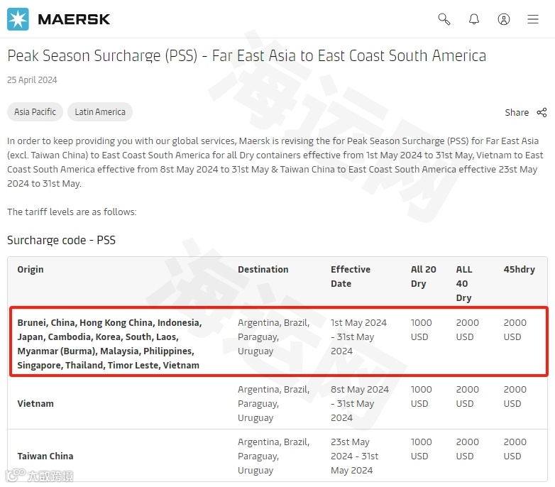 4月25日,马士基官网发布通知,修订(调升)远东亚洲(不包括中国台湾)至南美洲东海岸所有干箱的旺季附加费 (PSS),生效日期为2024年5月1日至5月31日;越南至南美洲东海岸有效期为2024年5月8日至5月31日;中国台湾至南美洲东海岸有效期为2024年5月23日至5月31日。20尺干箱1000美元,40尺和45尺干箱2000美元。