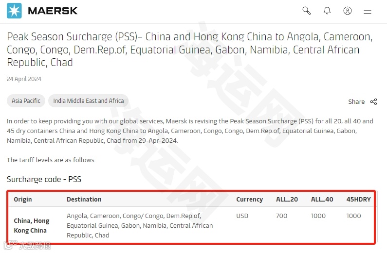 4月24日,马士基官网发布通知,自2024年4月29日起,征收中国和中国香港至安哥拉、喀麦隆、刚果、刚果民主共和国、赤道几内亚、加蓬、纳米比亚、中非共和国、乍得的旺季附加费(PSS)。20尺干箱700美元,40尺和45尺干箱1000美元。