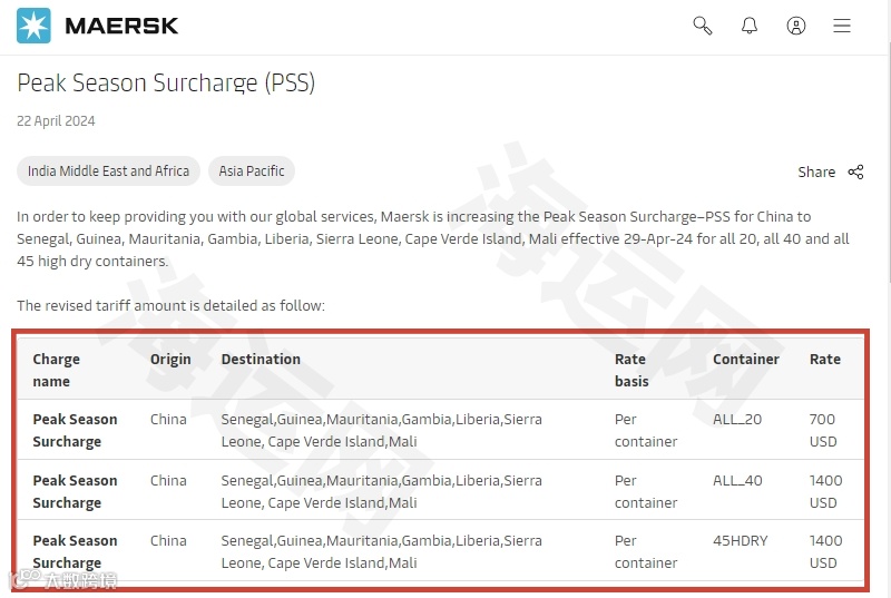 4月22日,马士基官网发布通知,自2024年4月29日起,征收中国至塞内加尔、几内亚、毛里塔尼亚、冈比亚、利比里亚、塞拉利昂、佛得角岛、马里的旺季附加费(PSS)。20尺干箱700美元,40尺和45尺干箱1400美元。