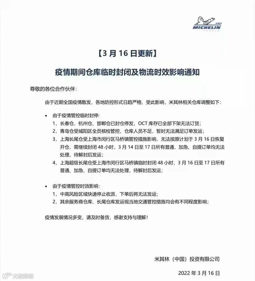 3月16日,米其林发布关于疫情期间仓库临时封闭及物流时效影响通知。