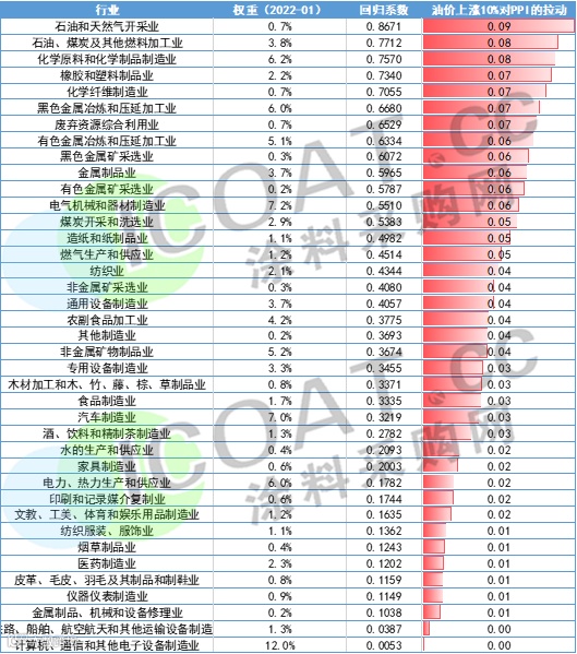 值得注意的是,除了化工行业之外,油价波动对多个行业PPI指数都将造成影响。油价主要影响PPI当中油气开采、燃料加工、化工制造、化纤制造等分项,原油价格同比对于这五大分项的影响系数均在70%以上。假设原油价格上行10%,这五大分项合计拉动约为0.38%,综合考虑油价上涨对其他行业的影响程度来看,业内人士认为油价波动10%会拉动整体PPI上涨约1.53%。